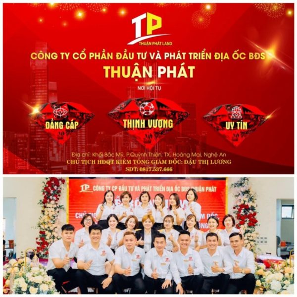 BĐS Thuận Phát là một trong những doanh nghiệp trẻ, năng động trong thị trường bất động sản. Suốt 2 năm hình thành và nỗ lực phát triển không ngừng nghỉ đã vươn lên trở thành một trong những doanh nghiệp lớn mạnh hàng đầu thị trường BĐS tại khu vực Hoàng Mai nói riêng và Nghệ An nói chung. Ngày nay Công Ty BĐS Thuận Phát đa dạng nhiều sản phẩm từ đất đấu giá, đất khu đô thị, nhà ở, chung cư và nhiều sản phẩm đất nền chất lượng trên toàn tỉnh.