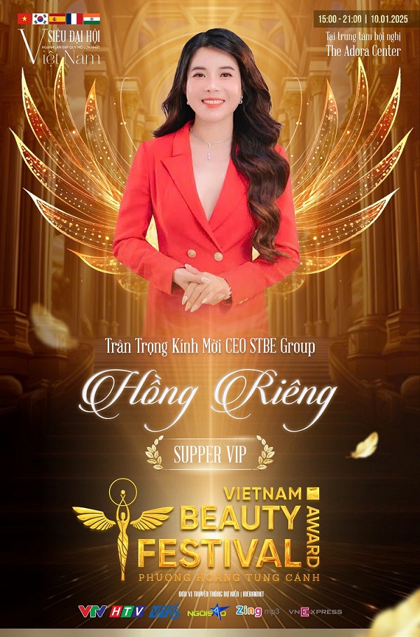Vừa qua, (ngày 10/1/2025), tại sự kiện “Viet Nam Beauty Festival Award 2025”, chị Trương Hồng Riêng đã vinh dự được vinh danh “CEO Xuất Sắc 2024” và “Thương hiệu – Sản phẩm – Dịch vụ được khách hàng tin dùng 2024″. Chương trình do tập đoàn STBE tổ chức. Đây là chương trình lưu lại khoảnh khắc hành trình vươn tới thành công, nơi tôn vinh sự bản lĩnh, nỗ lực không mệt mỏi của đội ngũ STBE và là cơ hội để tham gia kết nối chuyên môn, gặp gỡ đồng nghiệp trong ngành và góp phần tìm ra những tài năng trẻ đầy triển vọng.