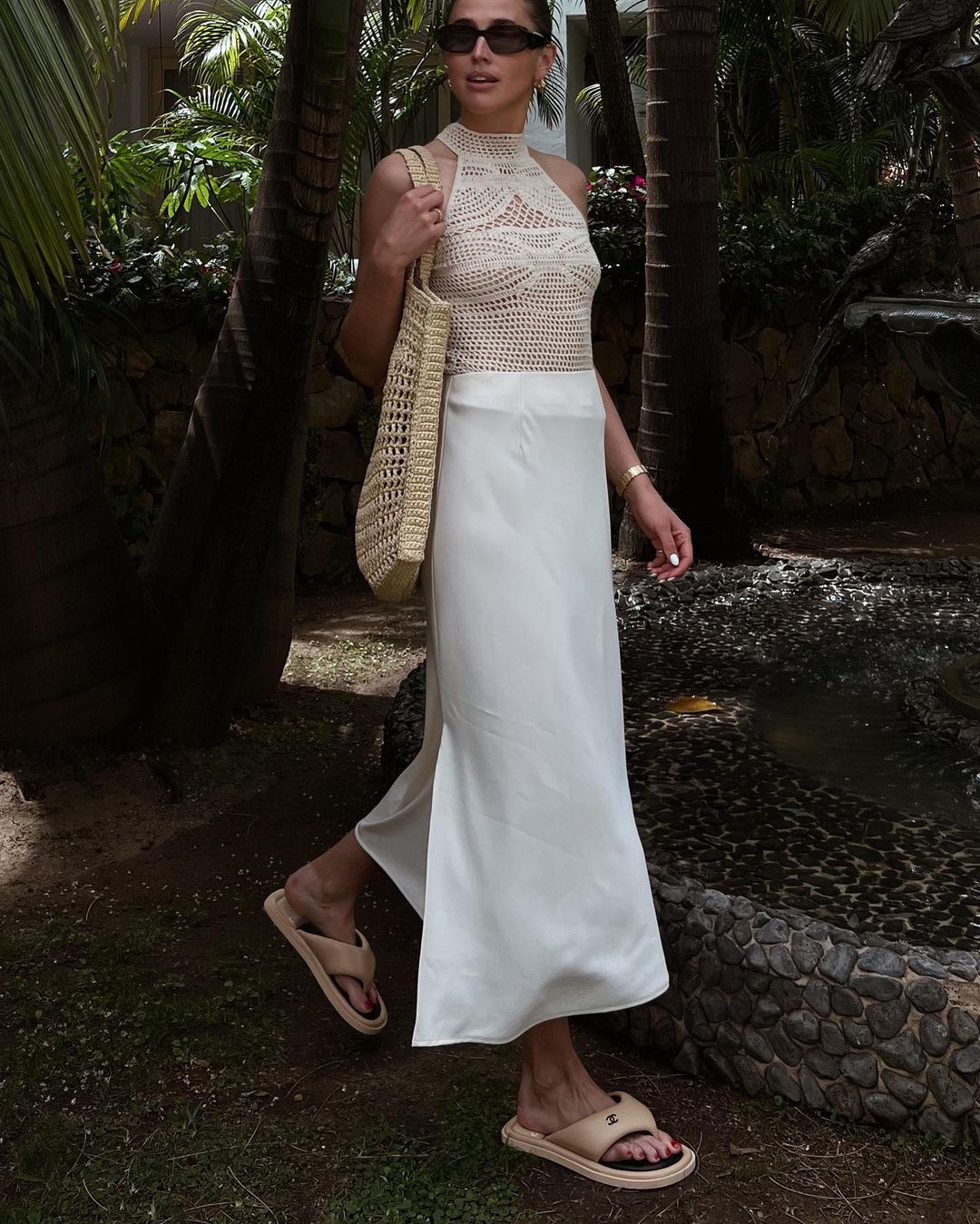 Vào những ngày nghỉ để ta thư thả, xả hơi, các nàng nên ưu tiên cảm giác nhẹ nhàng, dễ chịu với trang phục mang chất liệu mềm mại và thoáng mát. Áo cổ yếm crochet là item hoàn hỏa vừa mang “vibe” địa trung hải vừa có khả năng kích thích năng lượng tích cực nếu bạn lựa chọn những thiết kế màu sắc. Tô điểm bản phối bằng loạt phụ kiện phong cách kidcore như nhẫn nhựa, vòng cổ xâu hạt,… sẽ giúp bạn tiêu tìm lại niềm vui trong mùa du lịch.