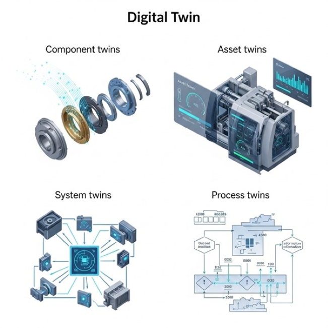 Có một số loại Digital Twin khác nhau, thường có thể hoạt động song song trong cùng một hệ thống. Các loại phổ biến nhất của Digital Twin bao gồm: