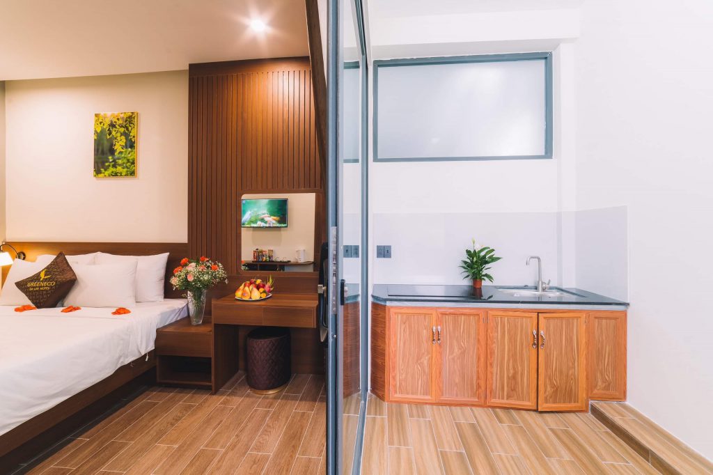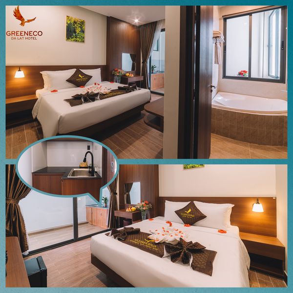 GreenEco Da Lat Hotel có khu khách sạn và khu biệt thự, được xây theo phong cách châu Âu rất đẹp và tinh tế, phòng thoáng, view rộng. Khung cảnh xung quanh cũng rất nên thơ với những hàng thông xanh rì, thẳng tắp tỏa bóng mát trên tất cả những con đường nhỏ nối liền các khu trong resort. Để hài hòa với khung cảnh đẹp và lãng mạn xung quanh, phòng ốc ở GreenEco Da Lat Hotel có phong cách thiết kế rất Tây với đồ gỗ màu kem, nâu tinh tế, những lọ hoa nhỏ xinh, đơn giản nhưng không đơn điệu.