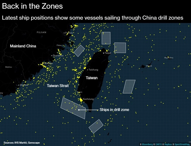 Theo dữ liệu thống kê của Bloomberg, có hơn 40 tàu chở hàng đã di chuyển qua các vùng tập trận nằm ở phía Nam đảo Đài Loan kể từ ngày 6/8 để tiếp cận cảng biển lớn nhất của hòn đảo này. Đến nay, có tới bốn khu vực tập trận ghi nhận hoạt động của các con tàu chở hàng.