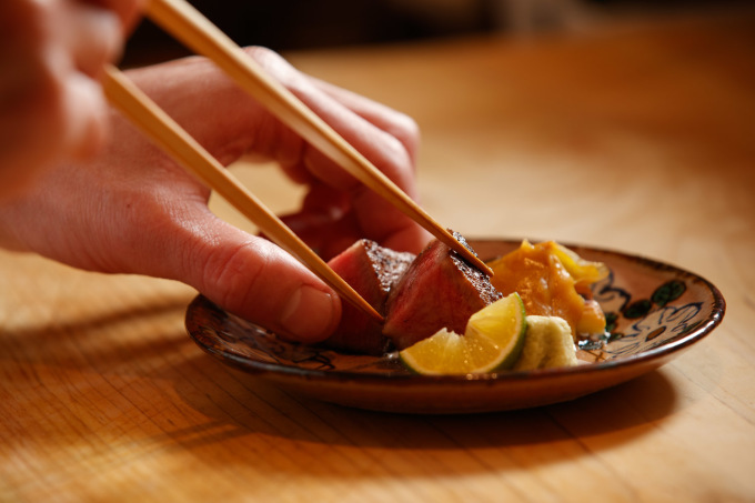 Thực khách sẽ cảm nhận phong cách tối giản của người Nhật theo mọi phương diện, từ nội thất, ánh sáng của nhà hàng cho đến menu hay phong cách nấu nướng, trang trí đồ ăn. Tất cả những gì đầu bếp làm với món phi lê bò là ướp thịt với hạt tiêu và muối trước khi nướng trên than củi trắng binchotan cao cấp. Combo bít tết giá khoảng 475 USD, kèm hai phần khai vị, salad, rau củ, bánh mì, trái cây theo mùa và trà hoặc cà phê.