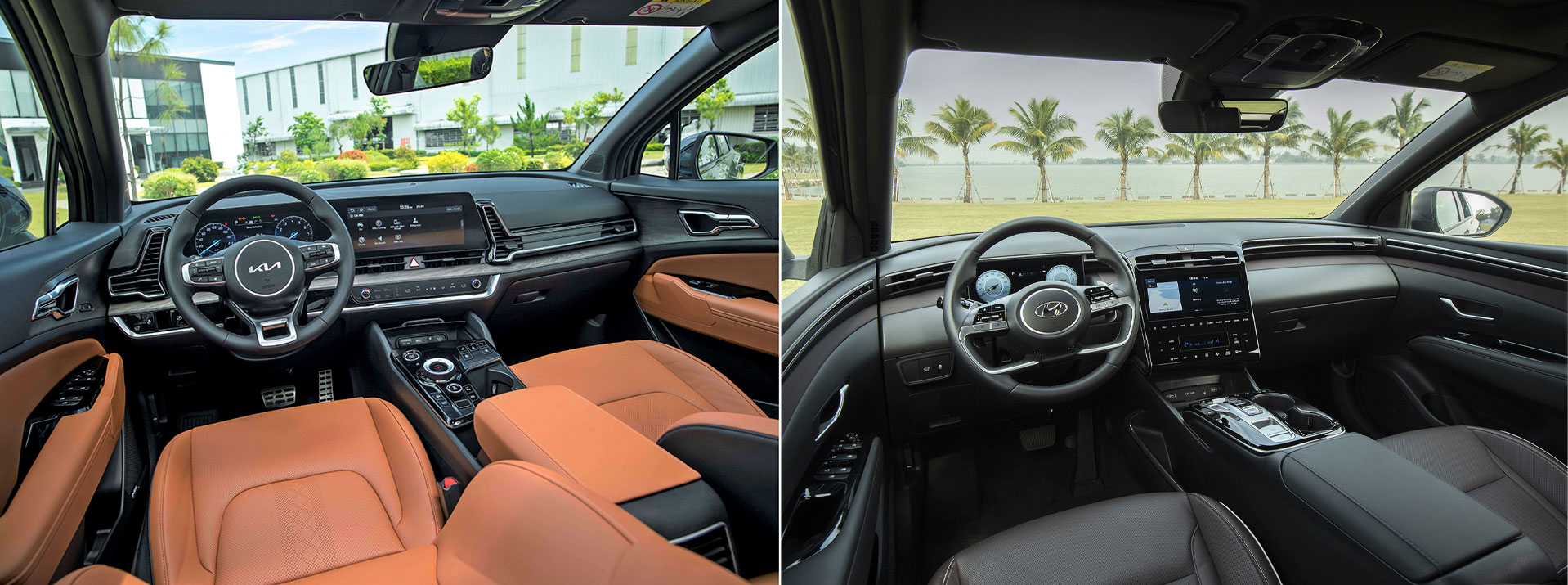 Tuy nhiên, một số khác biệt của 2 mẫu xe này có thể được tìm thấy ở bên trong; trong đó, Hyundai Tucson vượt trội ở ghế lái có khả năng sưởi và thông gió, vô-lăng cũng tích hợp hệ thống sưởi, cụm đồng hồ dạng Full LCD 10,25 inch, hệ thống âm thanh 8 loa Bose và có cả sạc không dây. Trong khi đó, KIA Sportage sở hữu một số điểm khác biệt: Màn hình giải trí 12,3 inch và lẫy chuyển số sau vô-lăng.