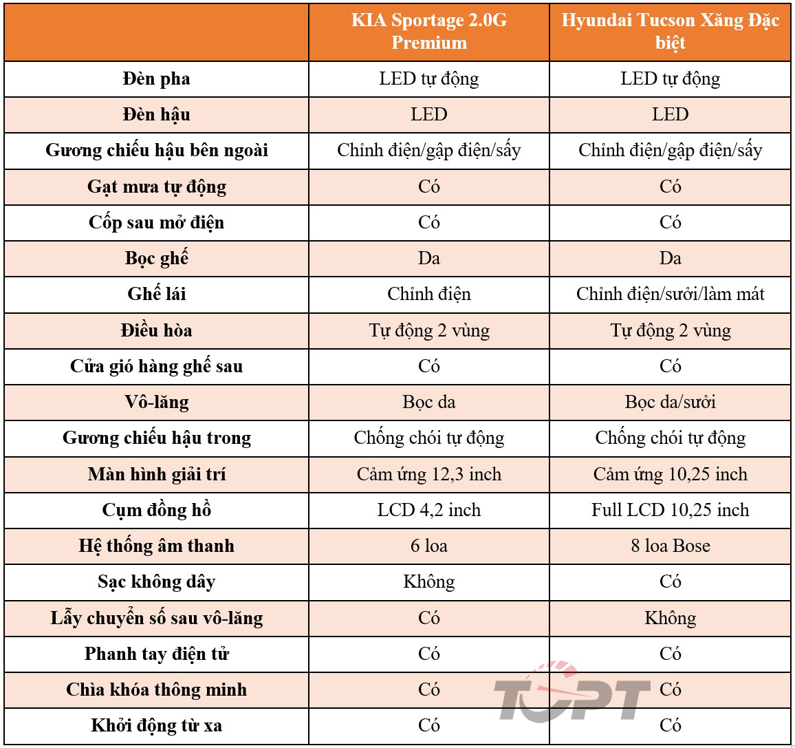 Đối với 2 mẫu xe này, các phiên bản KIA Sportage 2.0G Premium và Hyundai Tucson Xăng Đặc biệt sẽ được lựa chọn để so sánh trực tiếp do cả 2 đều có mức giá tương đương và nằm ở tầm giá trung bình trong số tất cả phiên bản, dự kiến sẽ thu hút khách hàng nhất.