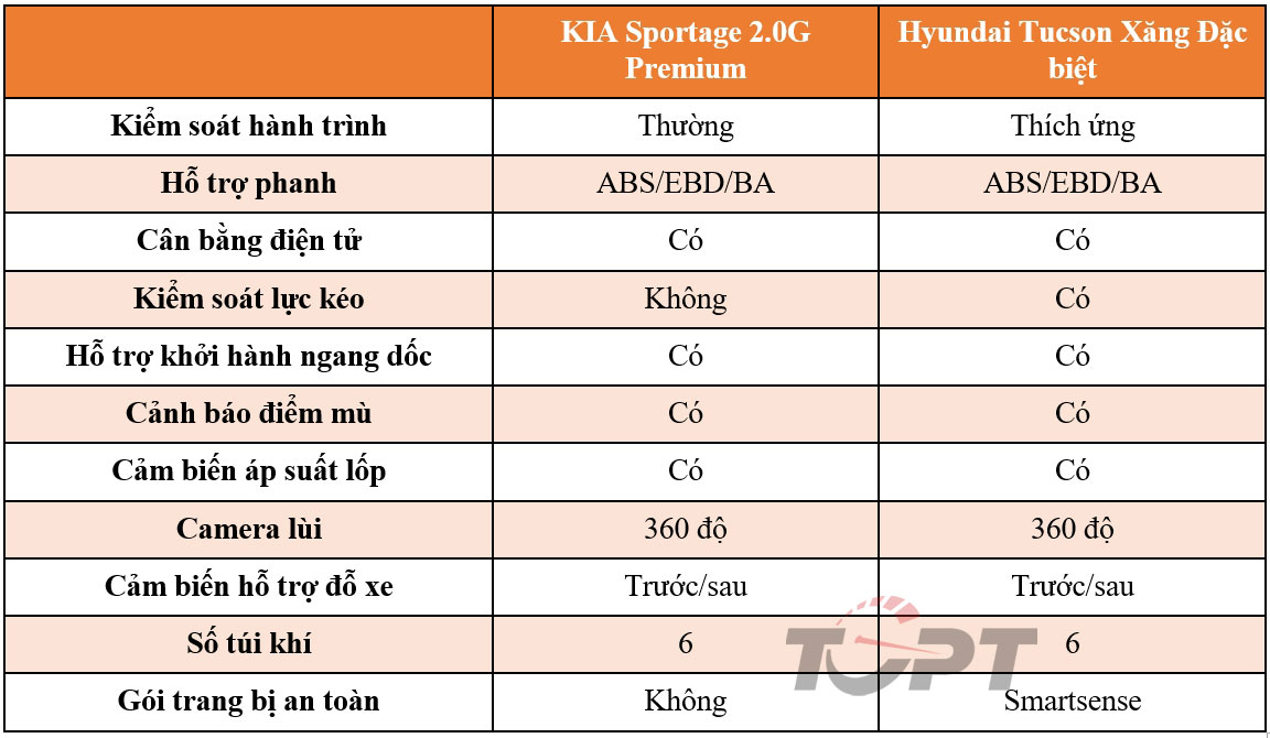 Đối với hạng mục an toàn và hỗ trợ người lái, Hyundai Tucson Xăng Đặc biệt có nhiều thế mạnh hơn hẳn so với KIA Sportage 2.0G Premium. Dễ nhận thấy nhất là việc mẫu xe Hyundai sở hữu gói trang bị an toàn Smartsense với các tính năng được tích hợp như: Hệ thống hỗ trợ giữ làn đường LFA, giám sát & phòng tránh va chạm điểm mù BVM & BCA, phòng tránh va chạm trước FCA và điều khiển hành trình thông minh Smart Cruise Control. Ngoài ra, xe cũng sở hữu thêm hệ thống kiểm soát lực kéo.
