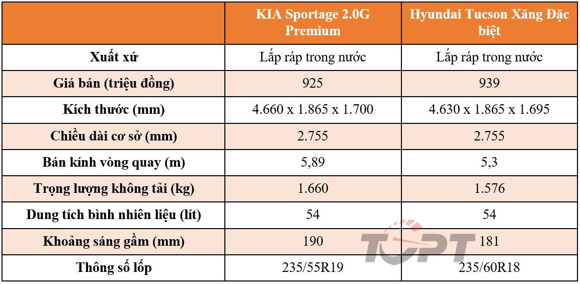 Dù có cùng nền tảng khung gầm và hệ thống động lực nhưng KIA Sportage 2.0G Premium và Hyundai Tucson Xăng Đặc biệt có nhiều khác biệt về các trang bị tiện ích và an toàn. Nhờ sự vượt trội đó, mẫu crossover của Hyundai xứng đáng với số tiền 939 triệu đồng khi cung cấp cho khách hàng đầy đủ các tính năng hiện đại, cùng hệ thống an toàn cao hơn. Tuy nhiên, hiện giá xe đang bị chênh khá nhiều cùng nguồn cung không ổn định nên sẽ khó đáp ứng cho tất cả các khách hàng.