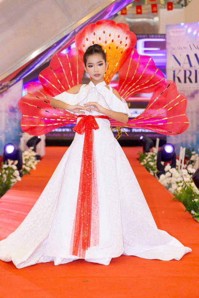 Với phong thái tự tin, mãnh mẽ và vô cùng dễ thương, Đặng Kiều Bảo Ngân như thỏi nam châm thu hút mọi ánh nhìn qua màu đỏ tươi của bộ trang phục. Dường như mẫu nhí càng làm cho sàn diễn thêm sinh động bởi những bước đi thần thái, dứt khoát và đầy tự tin, kiêu hãnh, đặc biệt là cú xoay 2 vòng đầy chuyên nghiệp trên sân khấu. Đây là nhiệm vụ cô cùng quan trọng mà NTK đã giao phó.