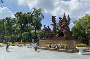 Tranh thủ ngày nghỉ, Nguyễn Minh Đức, 17 tuổi, cùng bạn mang hoa đến đặt tại tượng đài Công an nhân dân, tưởng nhớ ba chiến sĩ cảnh sát chữa cháy hy sinh, sáng 3/8.