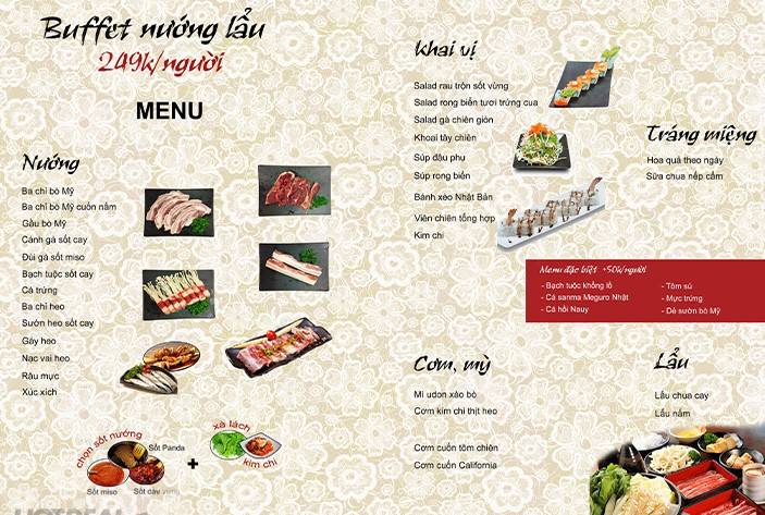 Nhà hàng Panda BBQ được biết đến với hình thức Buffet lẩu/nướng kiểu Nhật vô cùng hấp dẫn. Đồ ăn của quán được chọn lọc kỹ lưỡng từ khâu nguyên liệu luôn đảm bảo tươi ngon. Thịt được tẩm ướp theo công thức riêng đậm đà cùng với đồ chấm ngon hết ý được nhập khẩu trực tiếp từ đất nước Nhật Bản. Menu Panda BBQ đa dạng gồm buffet, gọi mọi lẩu nướng và các món ăn kèm.