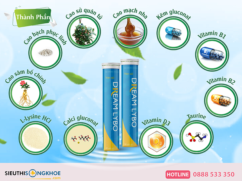 Thực phẩm bảo vệ sức khỏe Dream Lybo với các thành phần như: cao sâm bổ chính, cao mạch nha, cao sử quân tử, cao bạch phục linh… kết hợp cùng vitamin B1, B2, D3, các khoáng chất, kẽm gluconat… hỗ trợ bổ sung lysine, kẽm, một số vitamin cho cơ thể. Sản phẩm hỗ trợ tăng cường tiêu hoá, hỗ trợ ăn ngon, ngủ ngon.