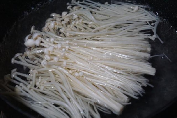 Bước 1: Nấm kim châm sơ chế sạch sẽ, cắt bỏ gốc. Đun sôi nước rồi cho nấm vào chần trong khoảng 2 phút, sau đó vớt nấm ra, bóp sạch nước.