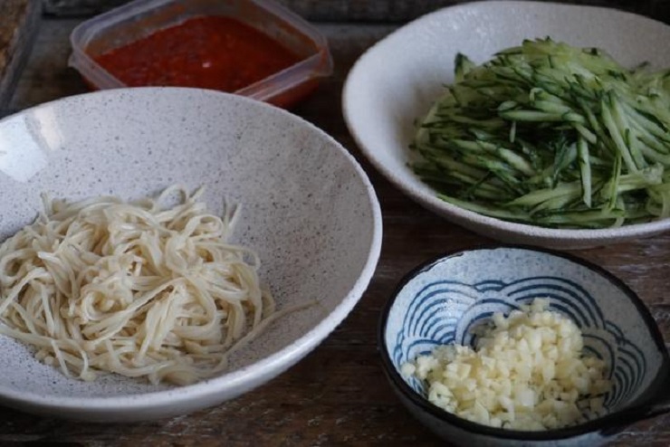 Bước 2: Dưa chuột rửa sạch, cắt đôi, bỏ bớt hạt, sau đó thái thành sợi nhỏ. Tỏi bóc vỏ rồi băm nhuyễn.