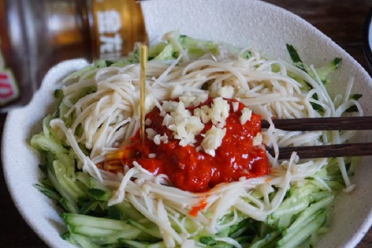Món nộm đơn giản từ dưa chuột và nấm kim châm rất thích hợp để làm món khai vị cho ngày hè nóng nực. Nấm kim châm dai dai ngọt ngọt cùng với dưa chuột giòn ngon, mát lạnh kết hợp với nước sốt cay, chắc chắn sẽ đánh bay cảm giác chán ăn, mệt mỏi vì thời tiết oi bức.