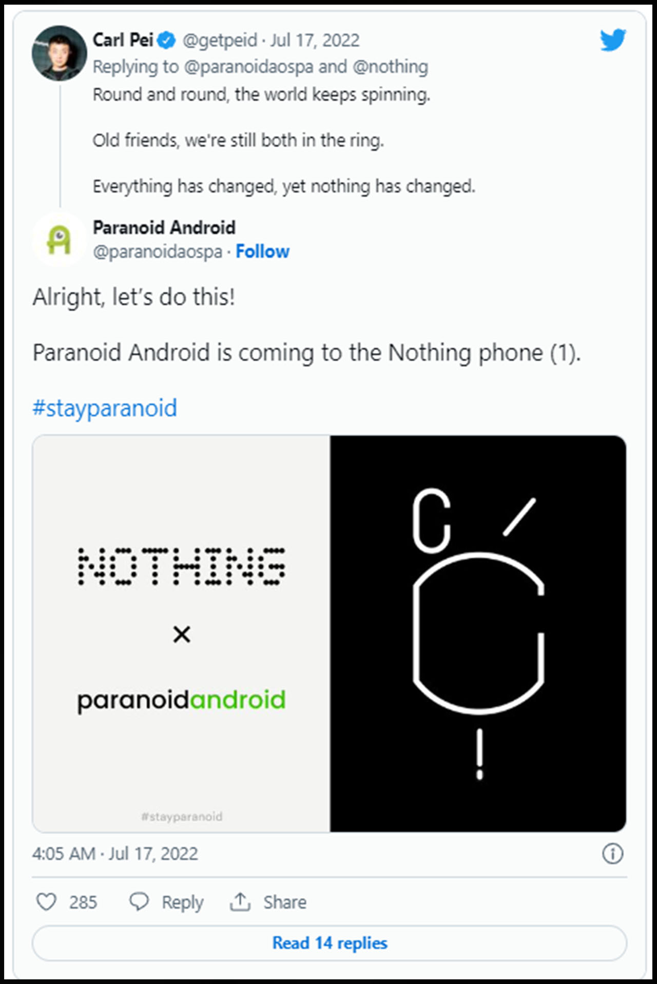 Thông tin này được Nothing đăng tải trên Twitter. Cũng theo nguồn tin trên, Paranoid Android là một trong những ROM tùy chỉnh phổ biến nhất trên thị trường smartphone.