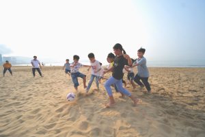 Tại Bình Định, các em nhỏ đã được tổ chức một buổi dã ngoại ở biển Quy Nhơn. Do chịu ảnh hưởng từ dịch Covid-19, sau 2 năm, các em tại Làng trẻ SOS Quy Nhơn mới được ra biển vui chơi. Thỏa thích đá bóng, nô đùa và hòa mình vào làn nước mát lạnh, nhiều em không giấu được sự phấn khích.