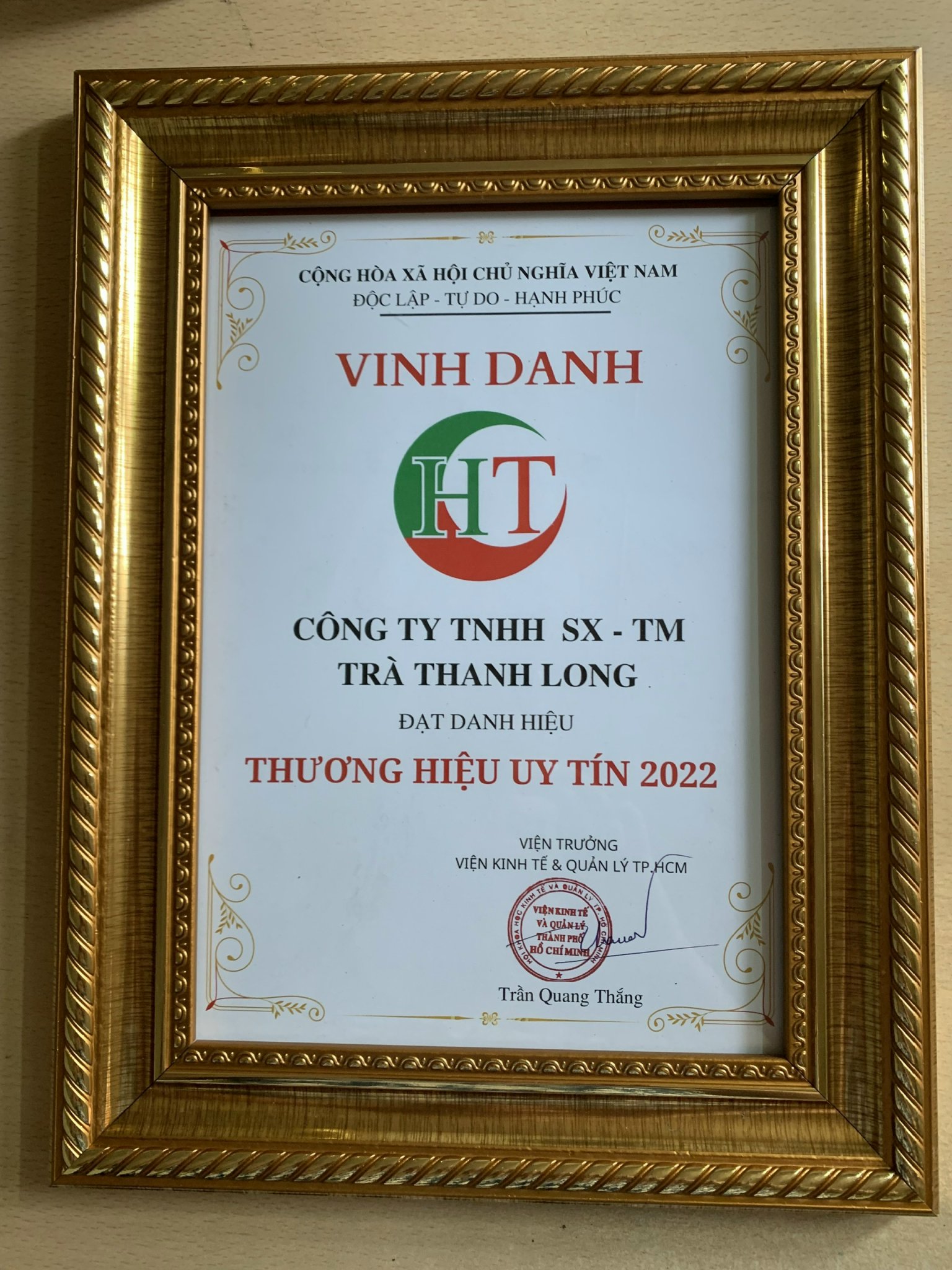 Mới đây nhất, CT TNHH SX TM Trà Thanh Long đã vinh dự nhận giải thưởng “Thương hiệu uy tín 2022”, trongchương trình “Tỏa sáng thương hiệu” được tổ chức tại TP.HCM. Ngoài ra, còn đạt giải khuyến khích tại cuộc thi “Khởi nghiệp đổi mới sáng tạo tỉnh Bình Thuận” vào năm 2020 – 2021.Không chỉ là một sản phẩm nổi bật trên thị trường nông sản trong nước, mà với người tiêu dùng, sản phẩm trà hoa thanh long còn là một loại thức uống thơm ngon tốt cho sức khỏe.