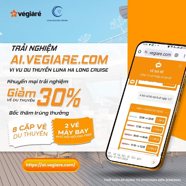 Nhằm khuyến khích khách hàng trải nghiệm dịch vụ mới này, CÔNG TY CP VÉ GIÁ RẺ triển khai một chương trình khuyến mãi đặc biệt từ ngày 07/07/2024 đến hết ngày 31/08/2024. Trong thời gian này, tất cả khách hàng mua vé máy bay và thanh toán qua http:/ai.vegiare.com sẽ nhận được nhiều ưu đãi hấp dẫn.
