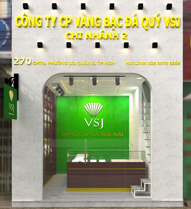 VSJ quận 3 tọa lạc tại tuyến đường nhộn nhịp Cách Mạng Tháng 8 , Quận 3 , nằm ngay trung tâm Thành phố sẽ là nơi mua sắm lý tưởng , thuận tiện cho các tín đồ thời trang . Showroom VSJ chi nhánh 2 trưng bày hàng trăm sản phẩm gồm trang sức, đá quý, vàng, kim cương với mẫu mã, thiết kế tinh tế.